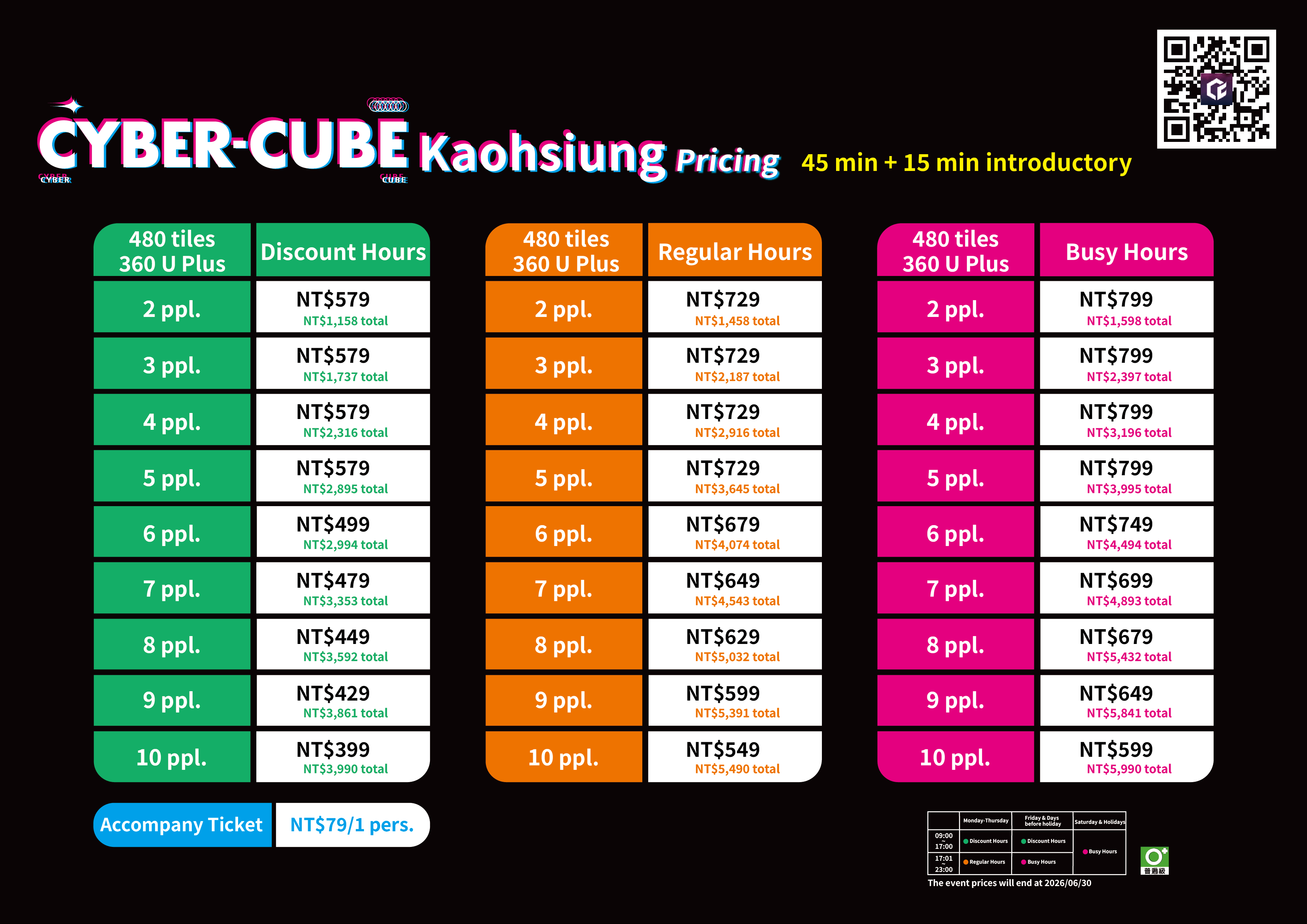 Due to system limitations, the 480-Tile Classic Challenge is designed for 2 to 10 players. If the number of players exceeds this limit, you must book consecutive time slots and split into groups. If groups wish to stay together throughout the session, Accompany Tickets must be purchased accordingly to ensure seating in the resting area.