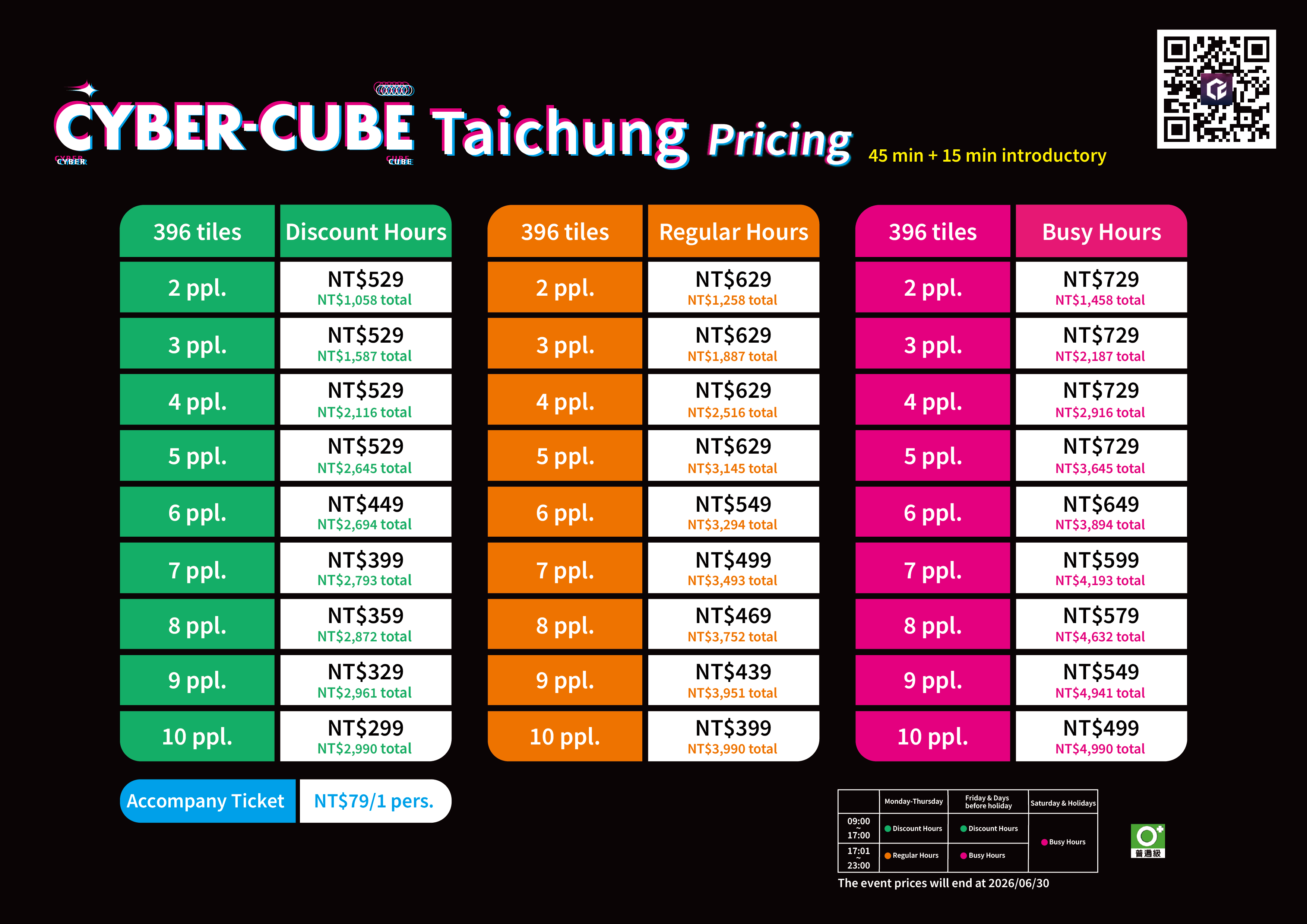 The reservation platform offers different discounted, regular, and busy hour prices. Please refer to the reservation website for the exact pricing. For more details, check the official website or promotional materials. CyberCube reserves the right to final pricing and interpretation.