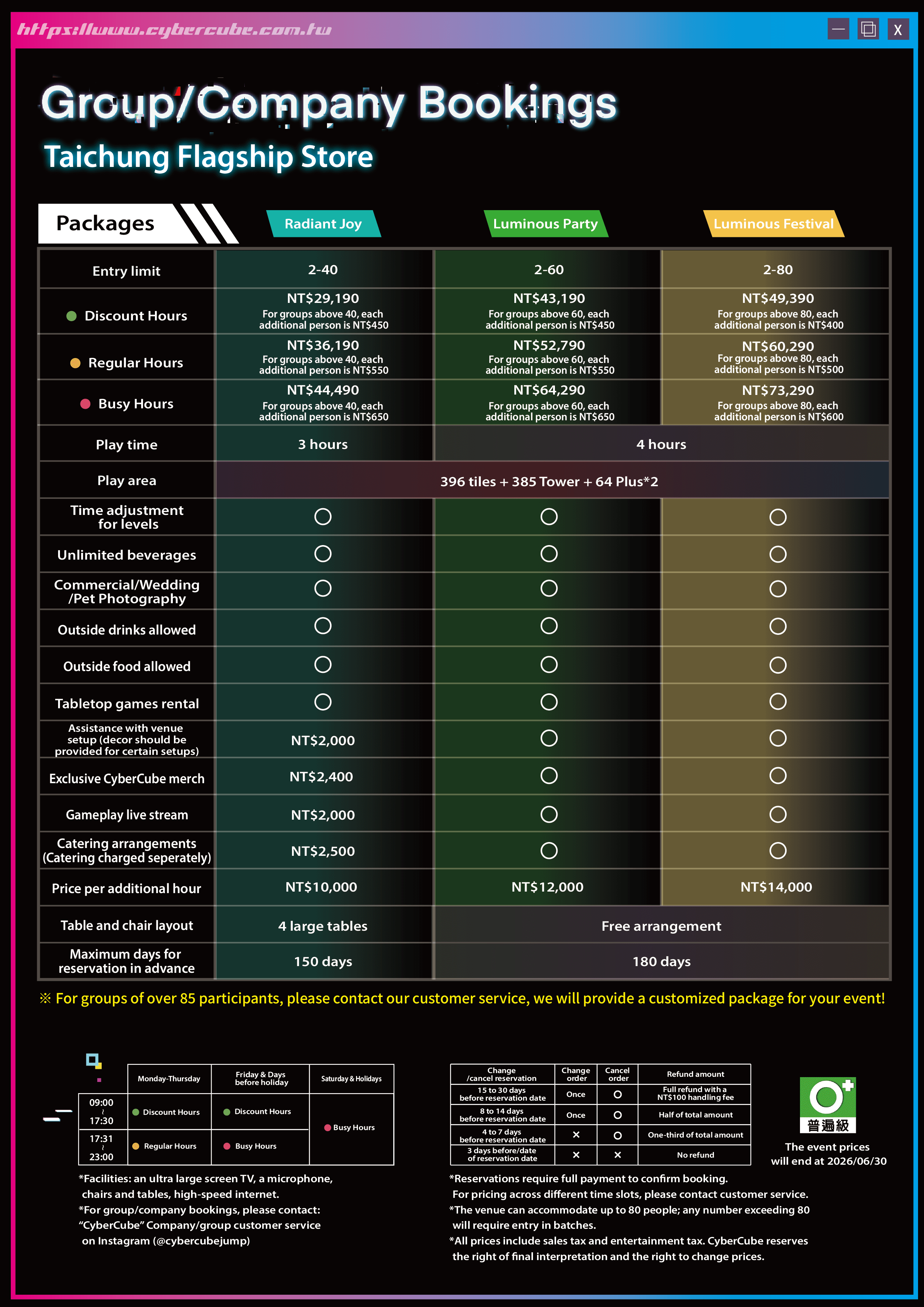 and add-on request as early as possible. Luminous Party Package includes a 4-hour experience, covering game