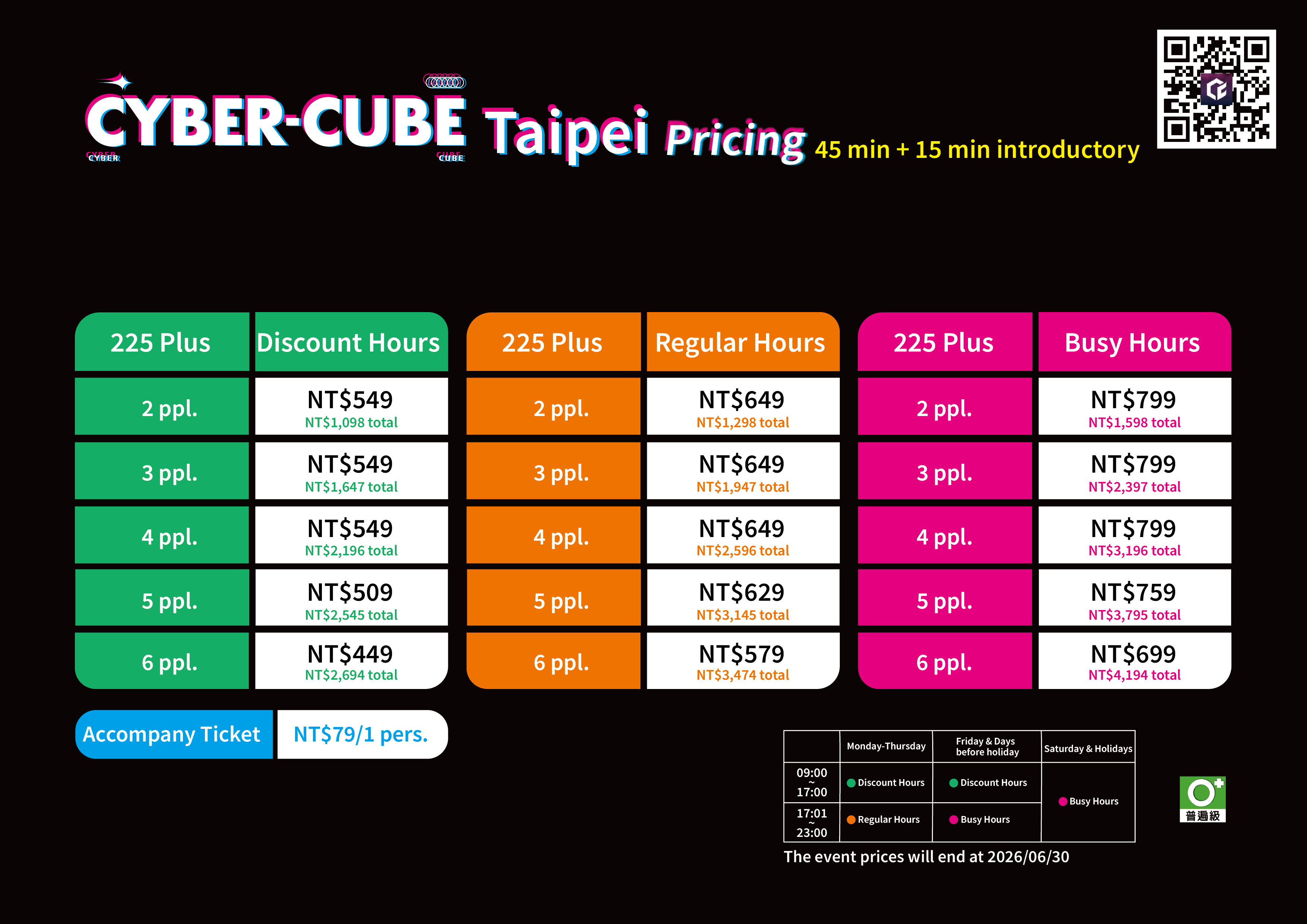The reservation platform offers different discounted, regular, and busy hour prices. Please refer to the reservation website for the exact pricing. For more details, check the official website or promotional materials. CyberCube reserves the right to final pricing and interpretation.