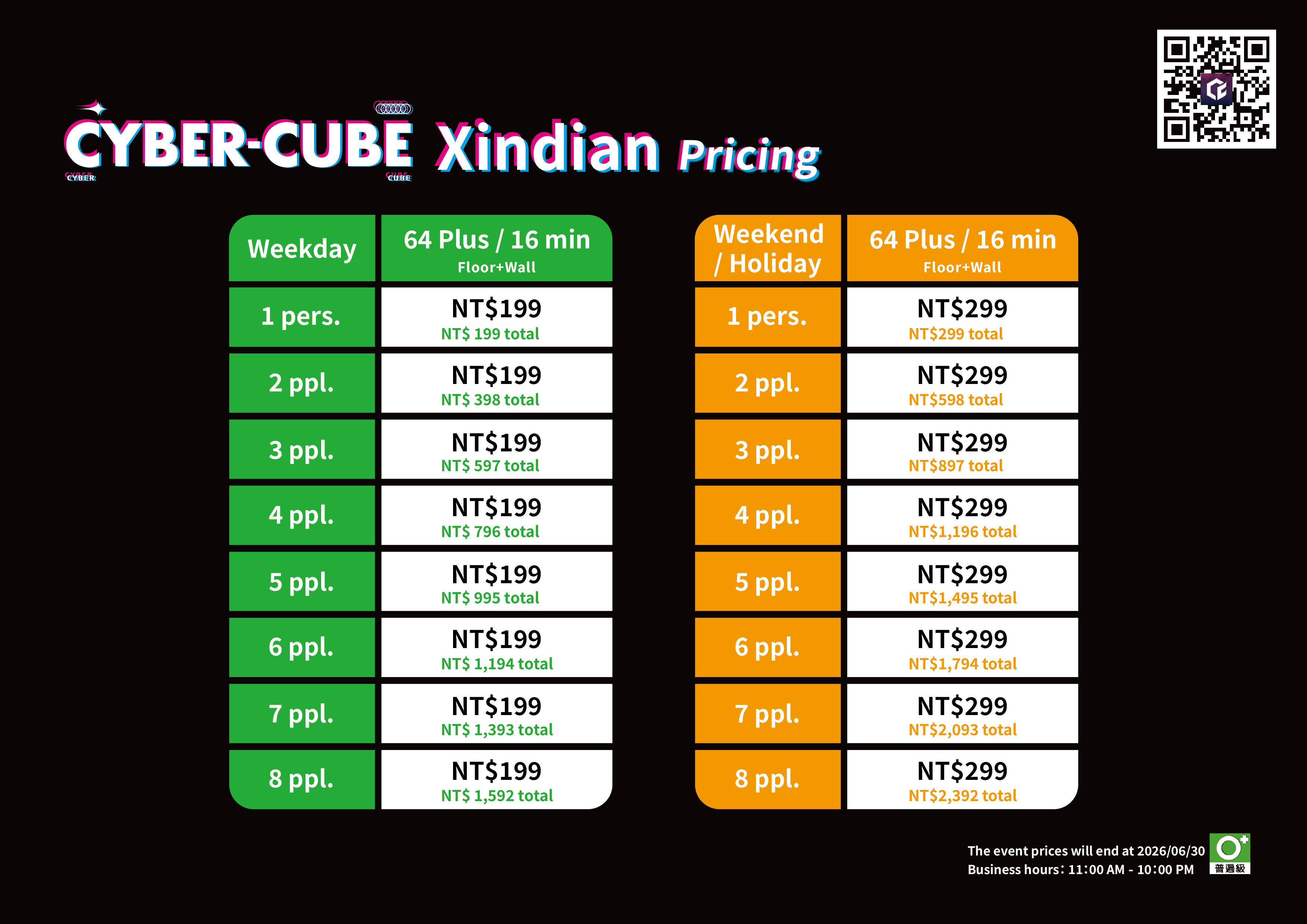 The reservation platform offers different discounted, regular, and busy hour prices. Please refer to the reservation website for the exact pricing. For more details, check the official website or promotional materials. CyberCube reserves the right to final pricing and interpretation.