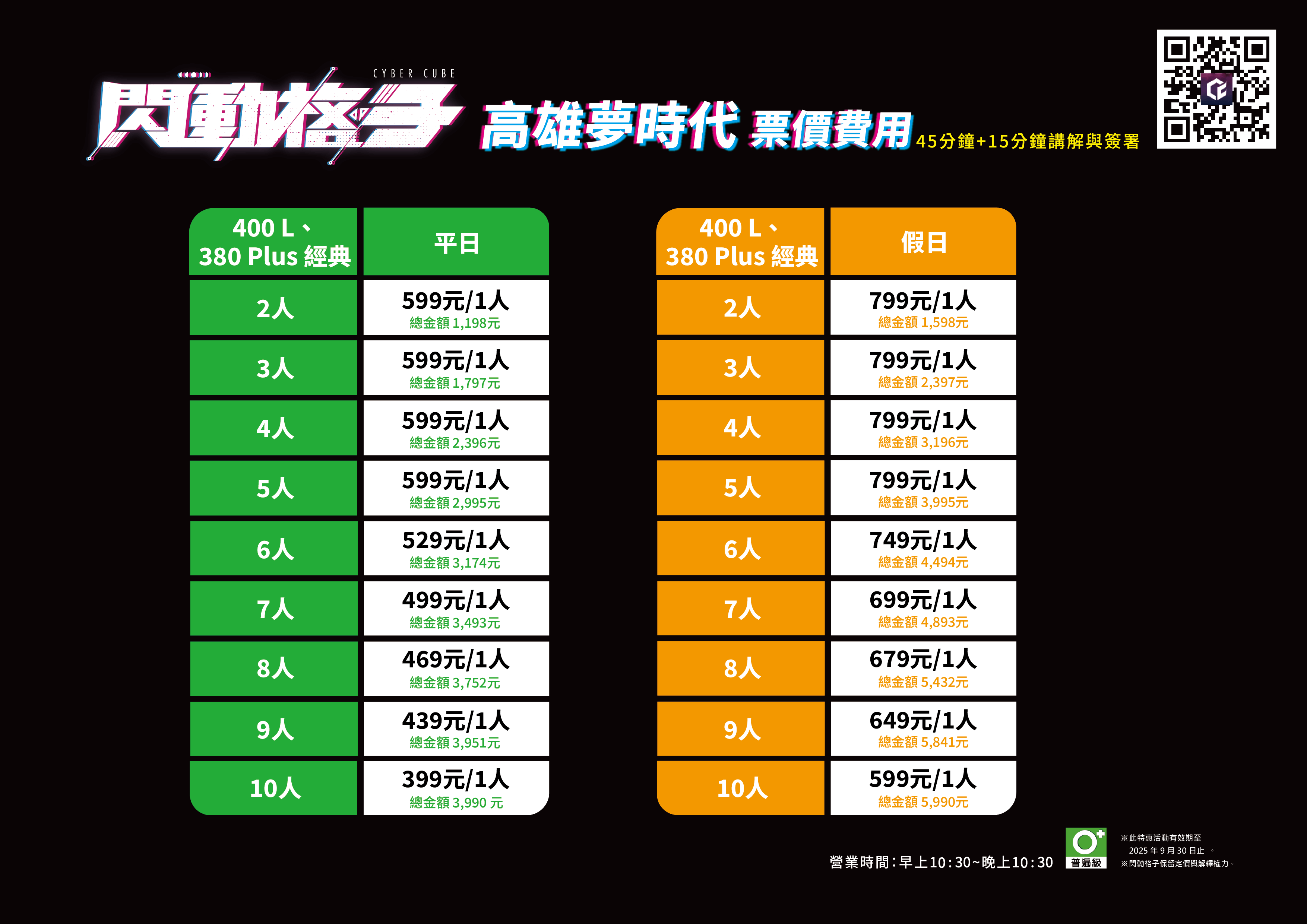 基於遊戲系統限制,380 Plus 挑戰區適用遊玩人數為 2 - 10 人。若超出適用人數,需預約連續時段並分組進行遊玩。