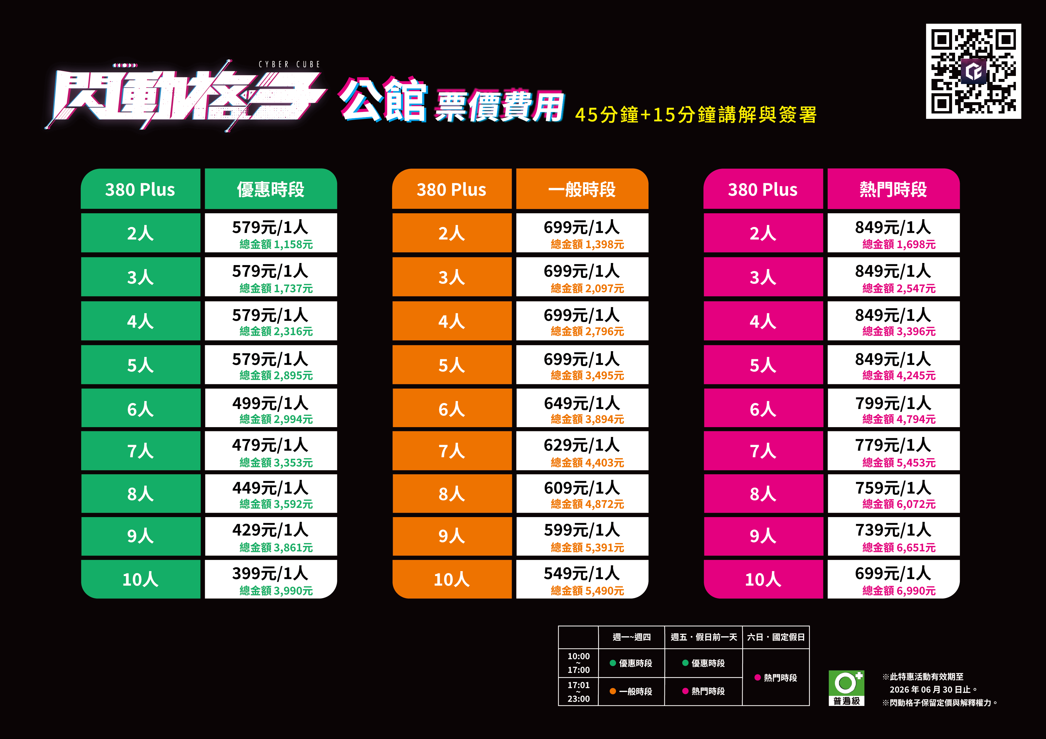 基於遊戲系統限制,380 Plus 挑戰場適用遊玩人數為 2 - 10 人。若超出適用人數,需預約連續時段並分組進行遊玩。若組別間希望全程陪同,須購買對應人數之陪同票,以確保休息區座位。