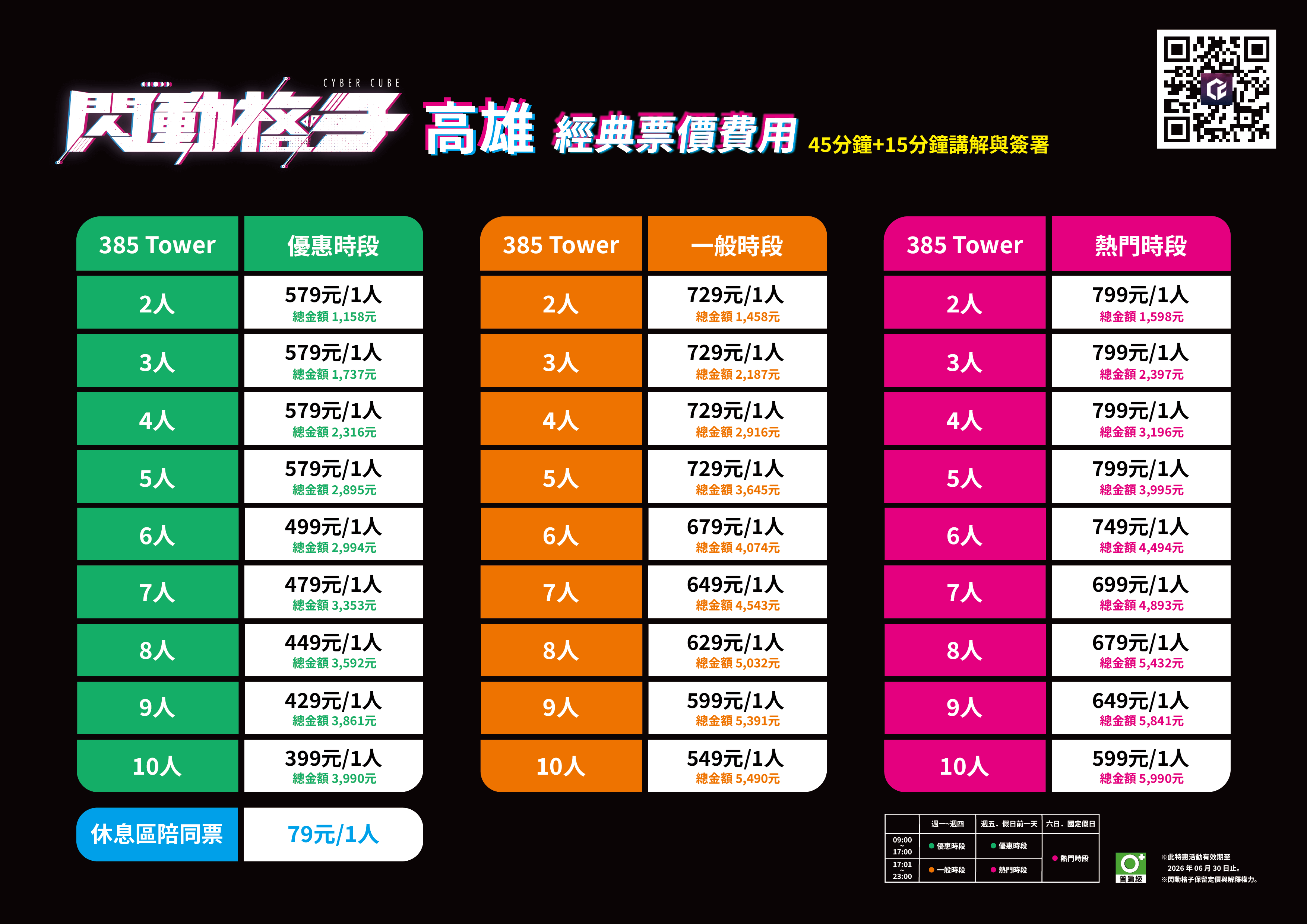 基於遊戲系統限制,385 Tower 挑戰場適用遊玩人數為 2 - 10 人。若超出適用人數,需預約連續時段並分組進行遊玩。若組別間希望全程陪同,須購買對應人數之陪同票,以確保休息區座位。