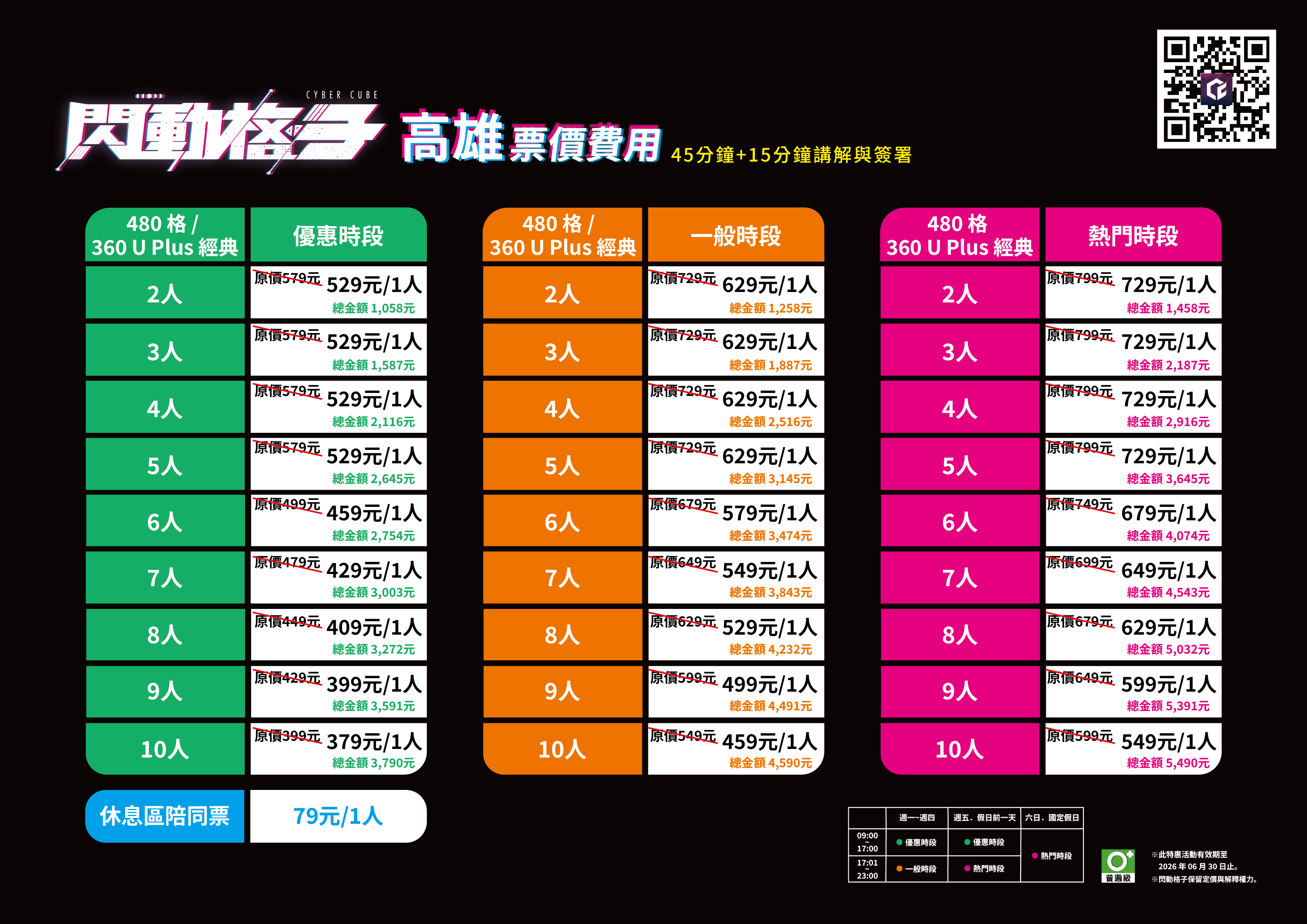 官方預約平台提供不同時段的優惠價格,具體費用請依照預約網站呈現為主,更多詳情請參考官方網站或宣傳品。「閃動格子」保留最終的訂價和解釋權利。