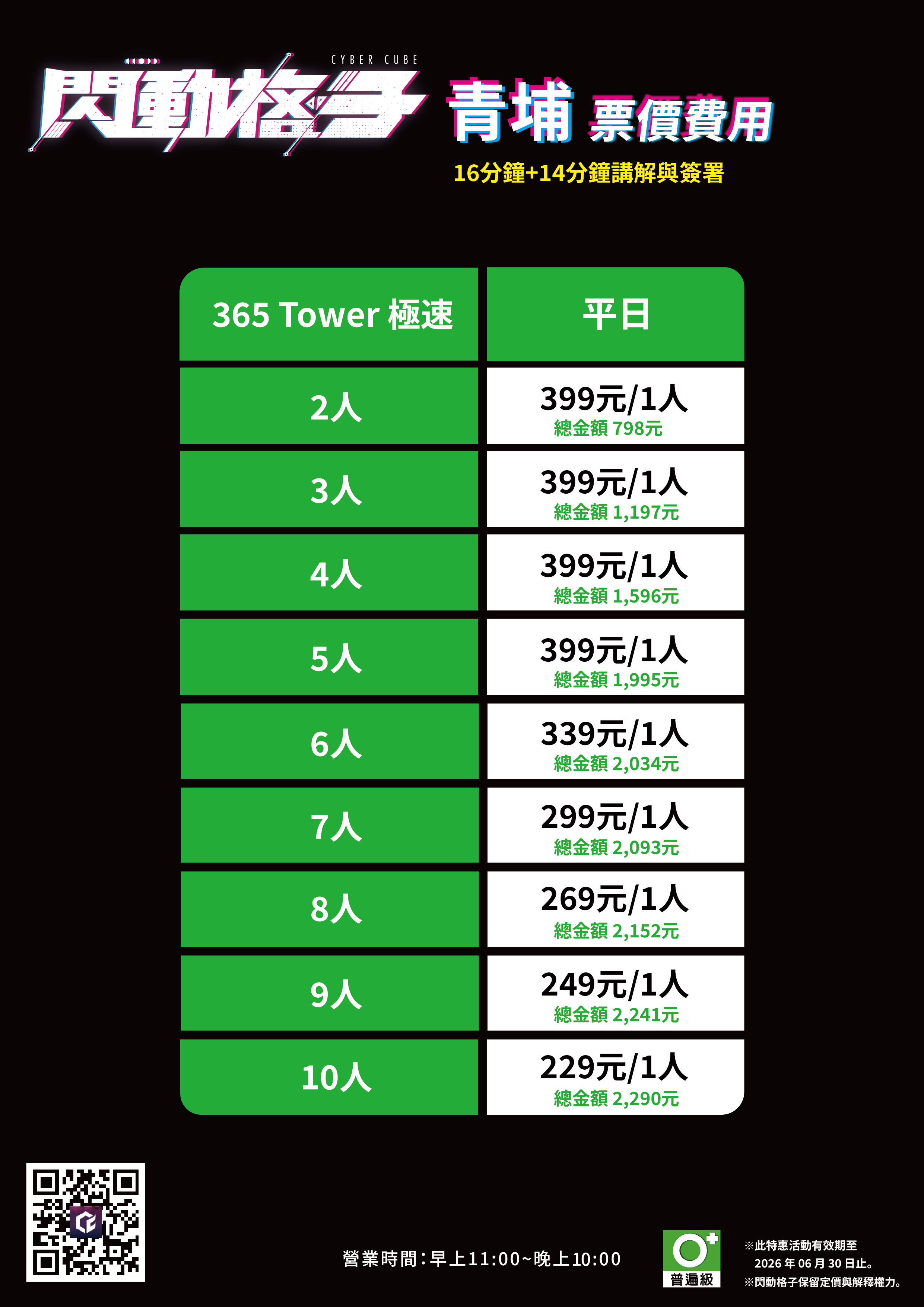 基於遊戲系統限制,365 Tower 挑戰區適用遊玩人數為 2 - 10 人。若超出適用人數,需預約連續時段並分組進行遊玩。