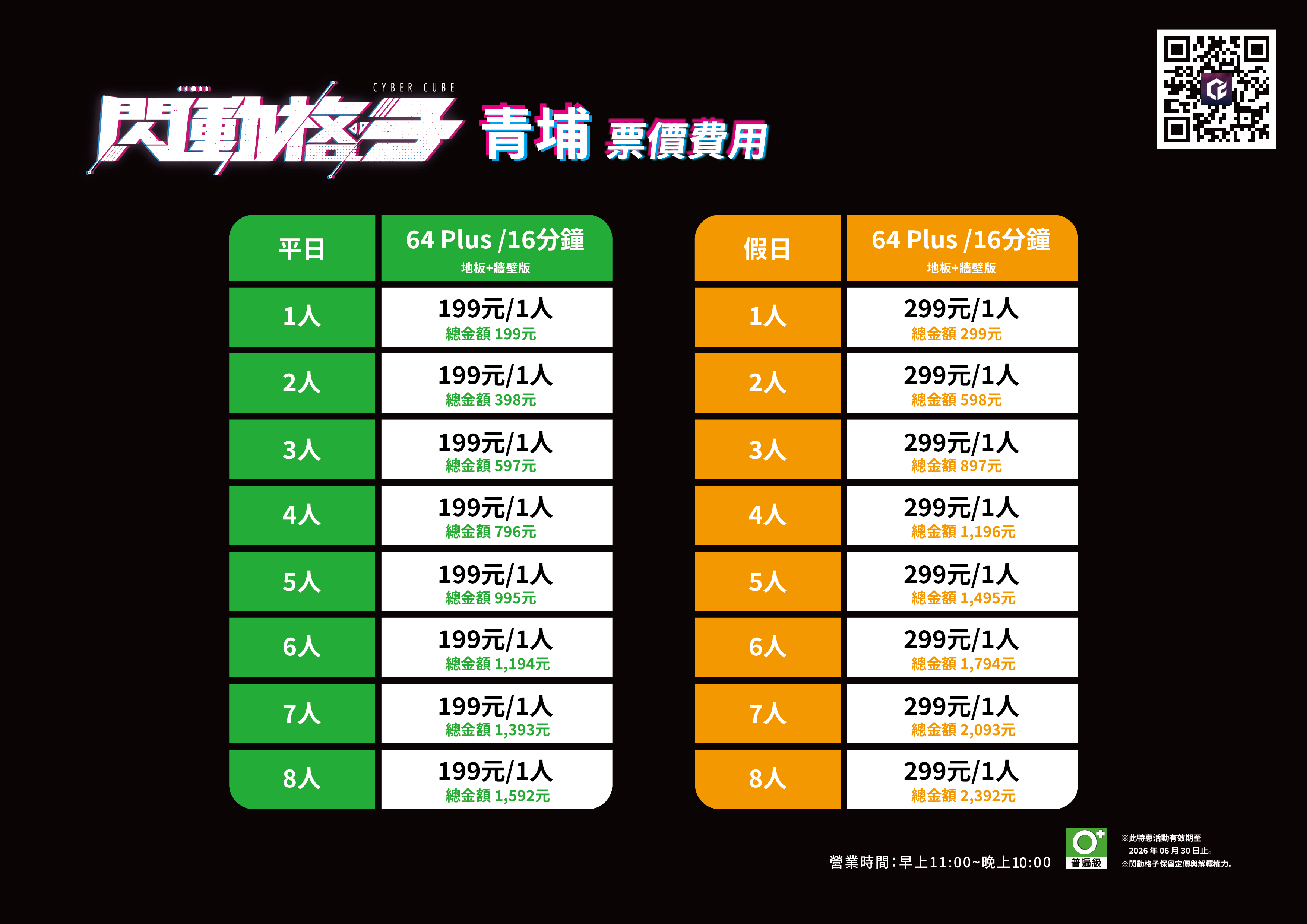 🎈 小小朋友(1-4 歲) 可選擇以下兩種方式: 1. 購買玩家票挑戰64格類型場域,需由法定監護人全程陪同。 2. 免票在休息區感受快樂的氣氛,仍需法定監護人全程陪同哦。 🎈 小小玩家(5-11 歲) 需法定監護人簽署風險聲明書,且挑戰全程至少需一位成人購買玩家票一同下場遊玩 🎈 青少年朋友(12-17 歲) 若監護人未陪同到場,需事先簽署風險聲明書,活動當日攜帶紙本即可參與活動。 📄 風險承擔說明書(下載) 📄 未成年填寫說明(範例) 不論大小挑戰者,我們提供的都是同等規格的服務。 因此,我們沒有提供兒童專用票價!